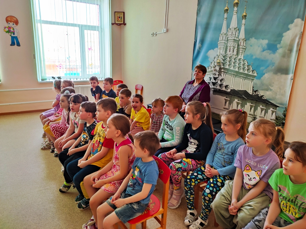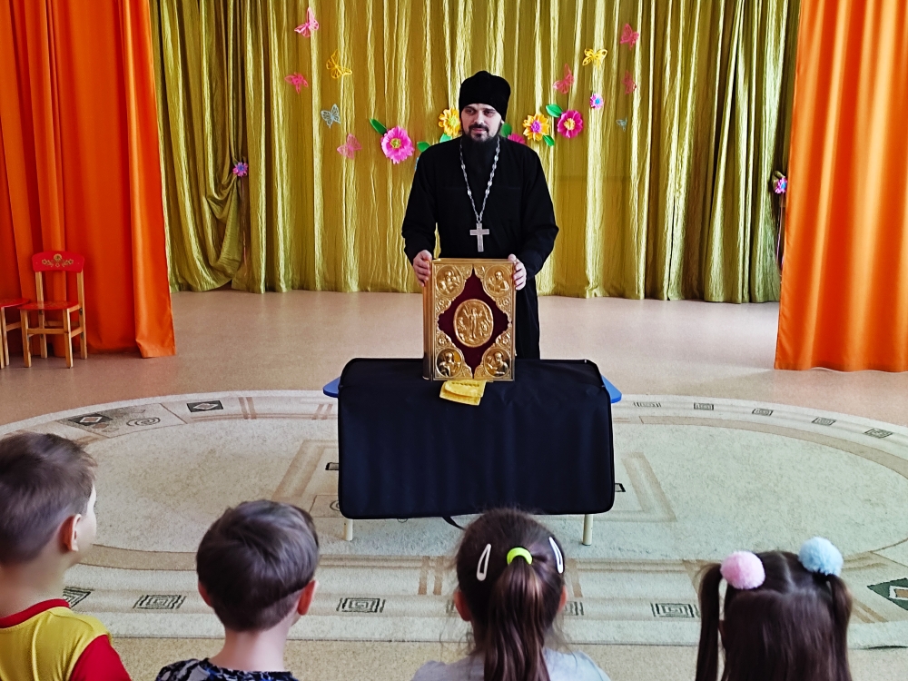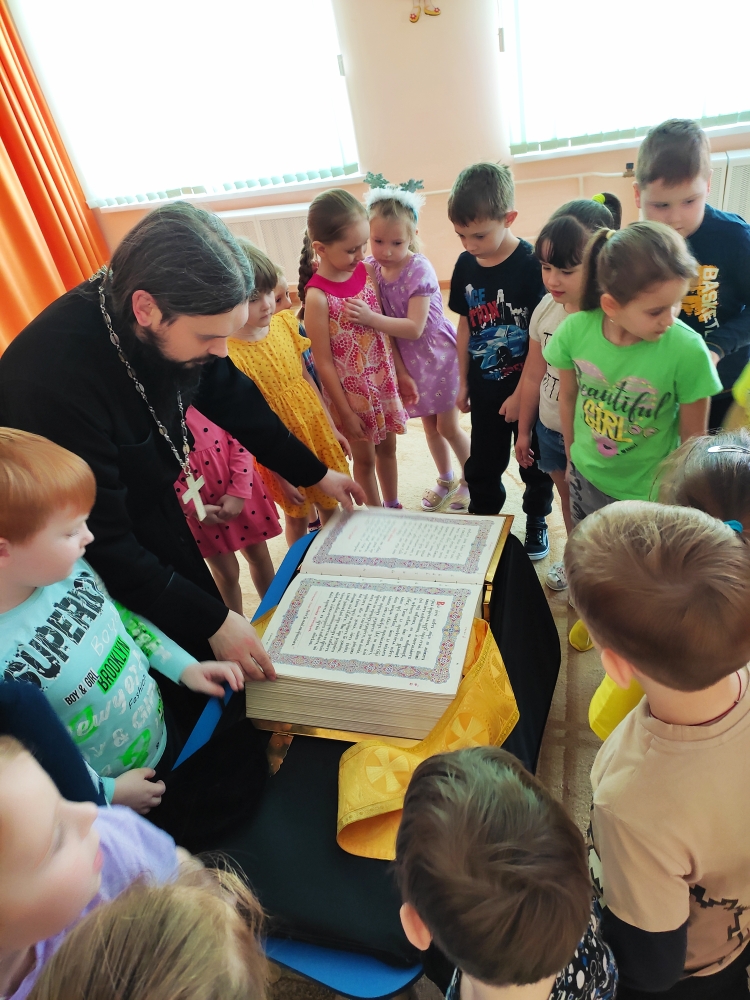 Прошла встреча с настоятелем Троицкого собора отцом Александром (Курмелёвым). Он принёс детям для ознакомления самую главную рукописную православную книгу "Евангелие", написанную на церковно-славянском языке. Дети с большим интересом и почитанием слушали рассказ священника о ней, рассматривали её странички, пытались найти и прочесть знакомые буквы и слова. Ребята подарили гостю фигурки ангелочков, сделанные своими руками.