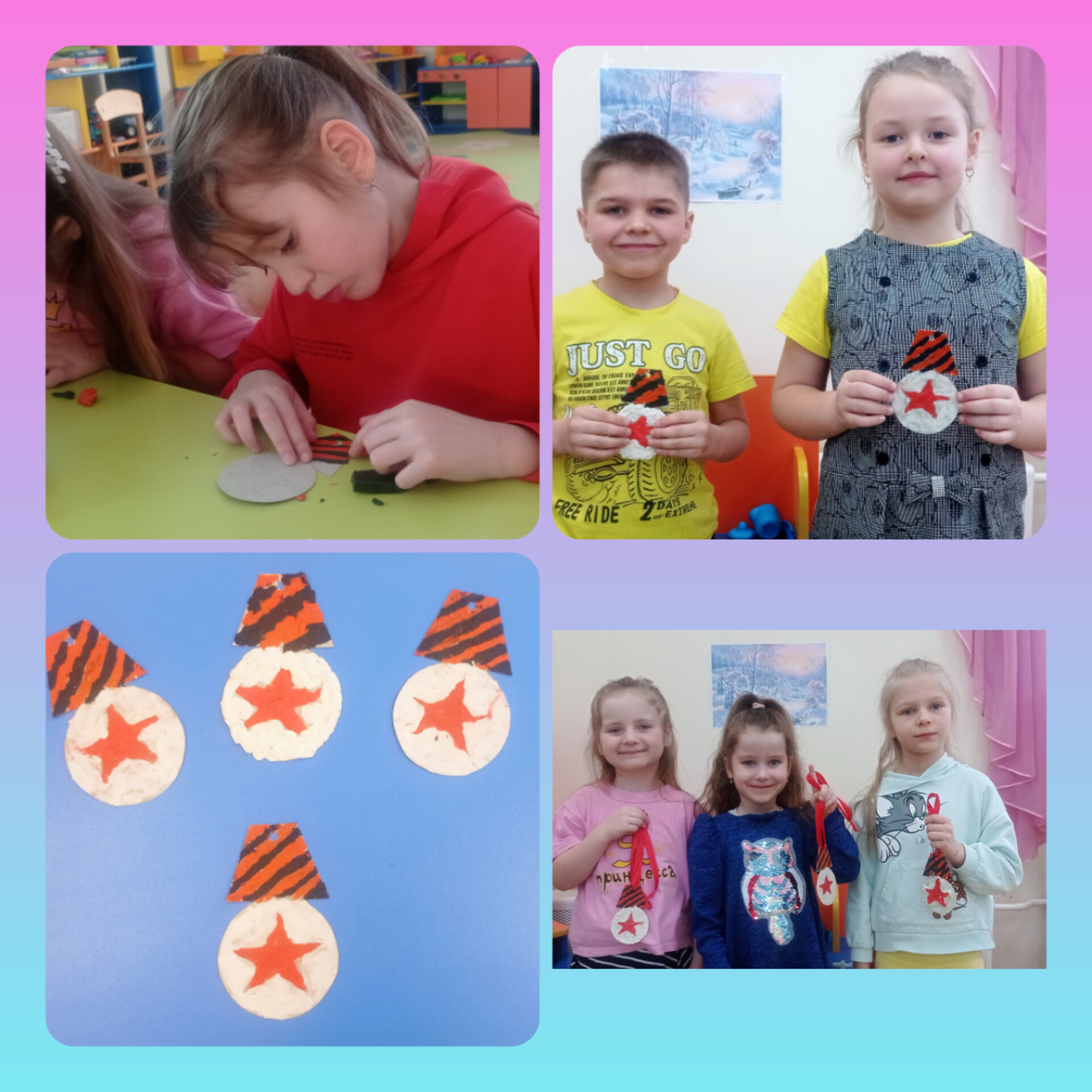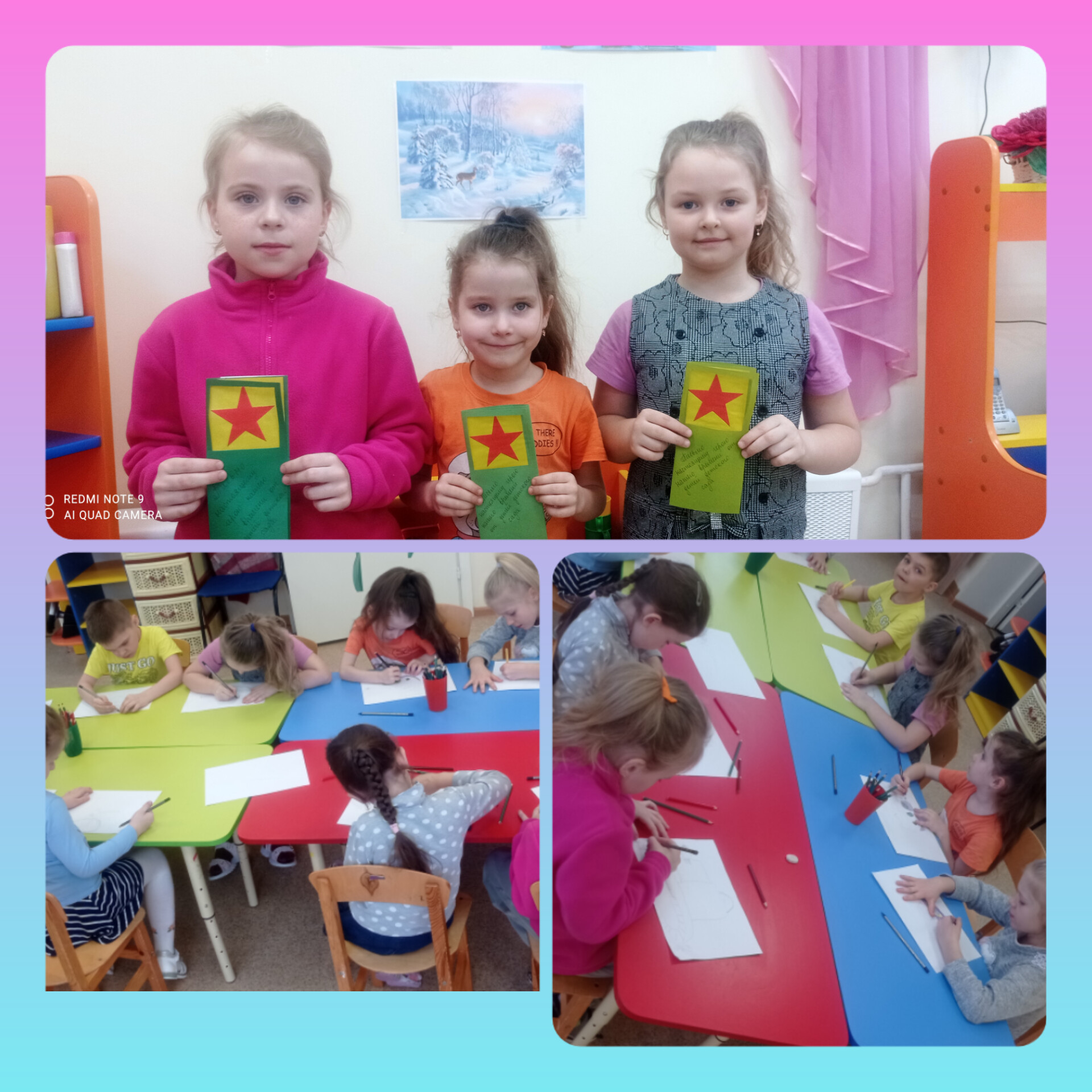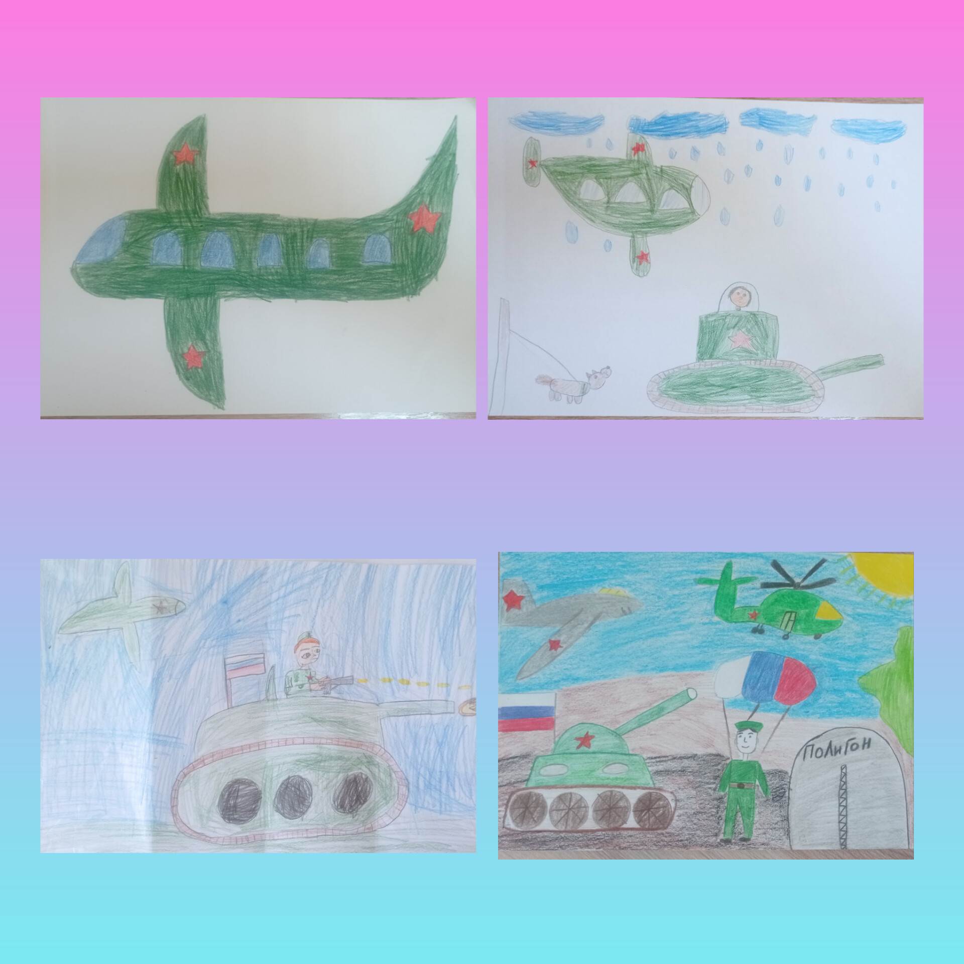В преддверии 23 февраля в группе под руководством воспитателя Е.В.Байковой была организована выставка детских рисунков "На страже мира и добра". На своих рисунках ребята изобразили представителей разных военных профессий, боевую технику наземного, воздушного и водного транспорта. А так же ребята сделали медальки для своих пап и дедушек. Ну, и конечно же в такое нелегкое время, мы решили не проходить мимо и сделать поздравительные открытки для мужчин, ребят, которые сейчас нуждаются в нашей поддержке.