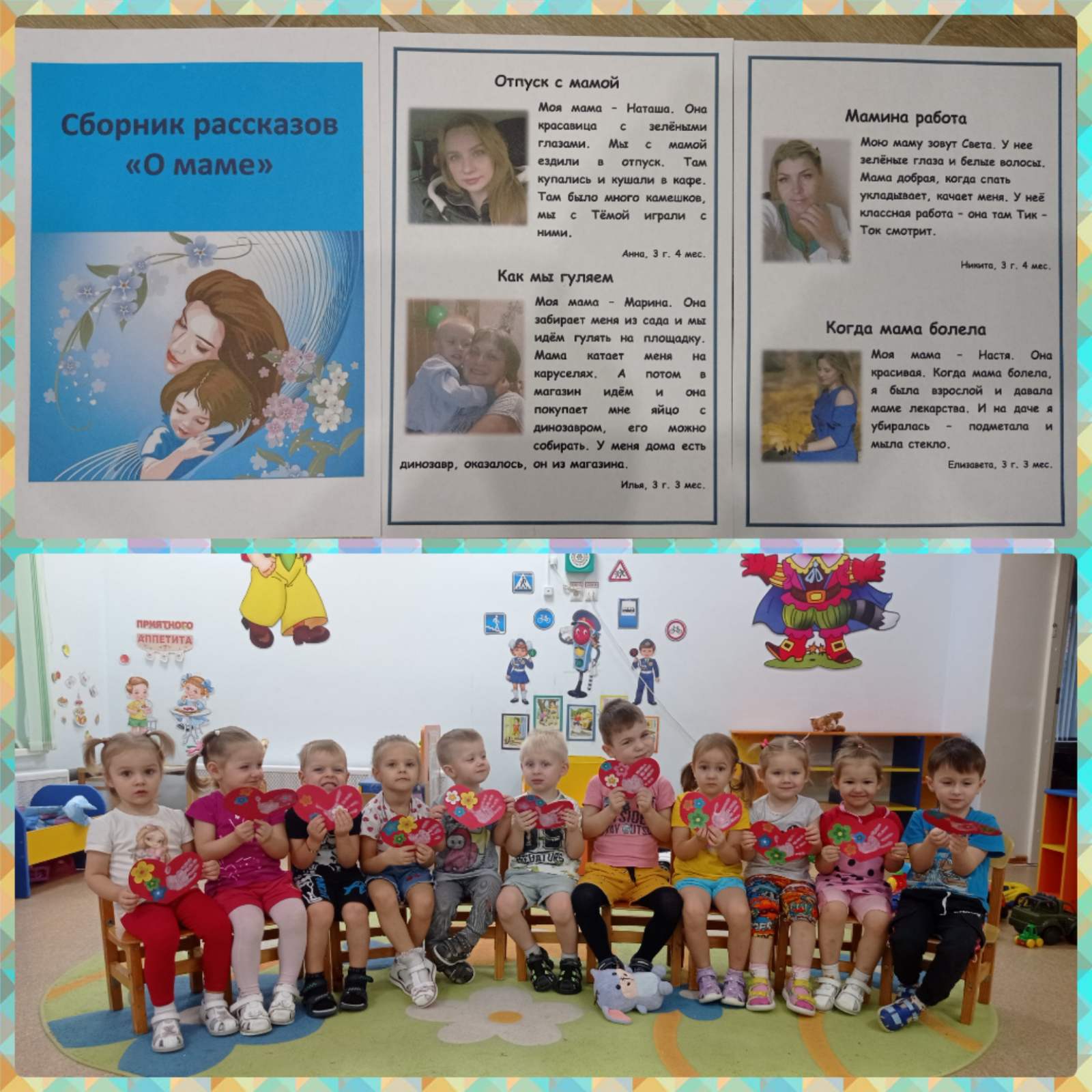 В преддверии этого праздника во второй младшей группе "Божья коровка" был реализован проект "Мама милая моя". Проект был насыщен разнообразными игровыми ситуациями ("Уставшая мама пришла с работы", "Мама в магазине", "Мама убирает дом"), художественно – эстетической деятельностью ("Мамина чашка", "Узоры на мамином платье"), беседами о семье и мамах. По мотивам этих бесед был составлен сборник детских рассказов "О маме". Ребята с большой увлечённостью мастерили открытки к празднику, чтобы поздравить своих любимых мамочек.