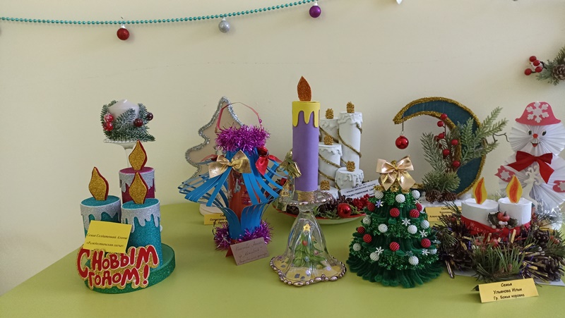 Новогодние и рождественские сюжеты семейного творчества украсили фойе детского сада и внесли неповторимый элемент в новогодний интерьер. Разнообразные ёлочки, забавные снеговики, заснеженные домики – всё сделано руками детей, родителей и педагогов ДОУ. Особую атмосферу волшебства выставки создали Рождественские свечи.