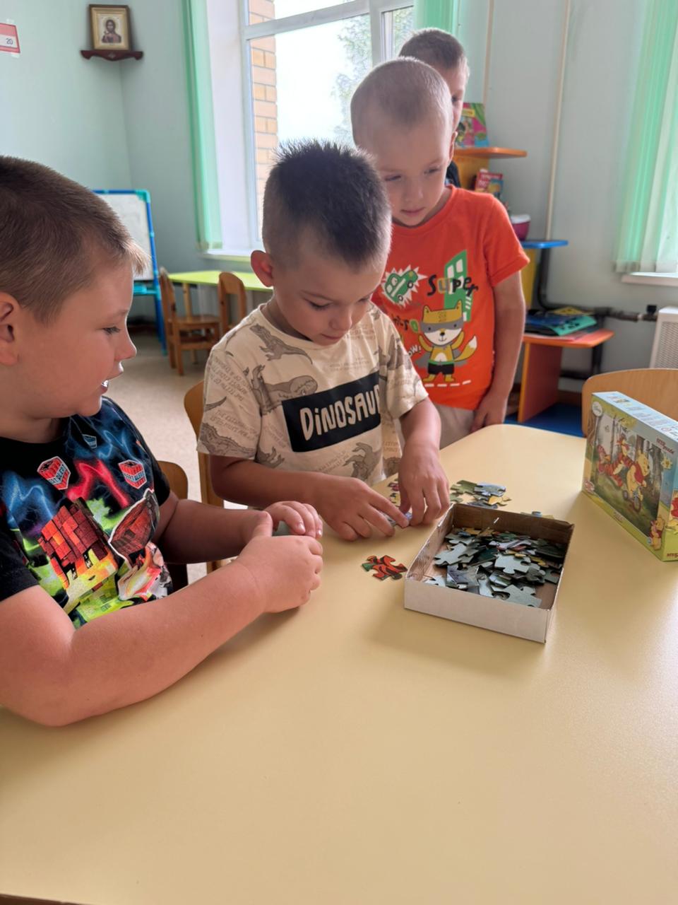 Дети группы «Пчёлка» очень любят собирать пазлы, их они раскладывают не только за столом, но и на ковре. Иногда ребята даже соревнуются между собой – кто быстрее соберет. Все очень стараются, в процессе выкладывания деталей ребята очень внимательны и крайне сосредоточены. Как всегда побеждает дружба. Этой игрой увлекаются и девочки, и мальчики.